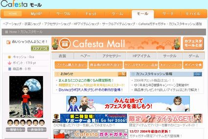 カフェスタの楽しみはアバターだ。 カフェスタではこのアバターが自分なんだ。 季節に合わせて衣装・背景を変えて楽しもう。 それとも恋人アバターもいいね アバターの衣装・アイテムはカフェスタモールで購入できる ウインドウショッピングだけでも楽しめるよ。 |
