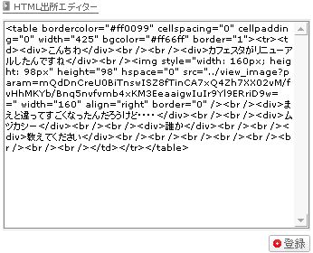 <table bordercolor="#ff0099" cellspacing="0" cellpadding="0" width="425" bgcolor="#ff66ff" border="1"><tr><td></td></tr></table> カフェの幅にぴったりな幅は width="425" 文字を入れようね <table bordercolor="#ff0099" cellspacing="0" cellpadding="0" width="425" bgcolor="#ff66ff" border="1"><tr><td>こんにちわ!</td></tr></table> 登録してみるよ |