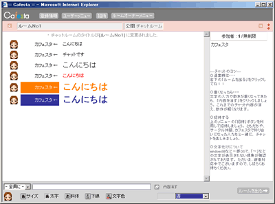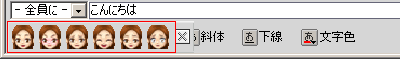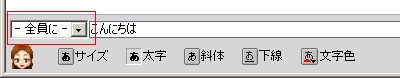 チャットの際に表示される文字の字の大きさ、字の太さ、斜体、下線、字の色などを 変更することができます。 また、文字の基本色をあらかじめ設定しておくこともできます。 |