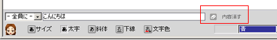チャットが長い間続き、会話のログが長くなったときや、 間違ったタグの使用で画面が乱れているときに、 テキスト入力フォームの横のケシゴムのアイコンをクリックすると、 チャットルームの内容をすべて削除することができます。 |