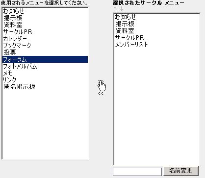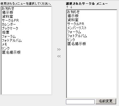 □お知らせ サークルオーナーからメンバーに対する"お知らせ"専用の掲示板です。 □掲示板 サークルメンバーが書き込める自由な掲示板です。 □ブックマーク ユーザーが気に入ったホームページを登録できるブックマーク機能です。 □投票 サークル内でいろいろな投票を行うことができます。 □フォーラム 議題ごとに返信を書き込むことができる形式の掲示板です。 □フォトアルバム 画像アップロードすることができます。 また、アルバム形式で閲覧することができます □匿名掲示板 IDなどが表示されない匿名の掲示板です。 □カレンダー メンバー間のスケジュールを書き込めるカレンダー機能です。 □外部リンク リンクを貼ることができます。 □メモ 気軽に書きこめ、「メモ用紙」のようにつかえる簡易掲示板です。 □サークルPR サークルの告知をサークルトップページにて電光掲示板で宣伝することができます。 □会員リスト サークルに加入しているメンバーのリストです。 ここからメッセージを送信することも可能です。 掲示板を削除したい 掲示板をすべて削除することはできません。 オーナーメニューの『メニューの構成及び設定』から 掲示板の『管理ツール』へ行き『アクセス設定』で設定を行なえば 見えなくすることができます。 掲示板とフォーラムの違い 掲示板は書き込みの順や、書き込みの返信によって表示されますが、 フォーラムはある議題に対して書き込んでいくタイプの掲示板で 議題に書き込みが繋がるように表示される掲示板です。 掲示板の数を増やしたい オーナーメニュー内の 『メニューの構成及び設定』→『メニュー管理』→『メニューの追加』 において増やすことができます。 最大10個まで設定が可能です。 サークルのメインメニュー サークルのメインページで見える『お知らせ』『掲示板』は変更できません。 サークルメニューの名前を変更したい オーナーメニューの『メニュー構成及び設定』において すべてのメニューの名称を変更することができます。 メニューの順番を変更したい オーナーメニューの『メニューの構成及び設定』にて変更することができます。 メニュータイトル横の'↑/↓’ボタンを利用して順番を変更してください。 背景・ロゴイメージの変更 使用するイメージファイルはGIFまたはJPGファイルのみ可能です。 背景は画像を単純に反復しながら利用することになります。 他のサークルのイメージを無断でコピーするのは禁止されています。 登録情報変更ボタンを押した後、システムの状態によって 多少変更が遅くなる場合があります。 問題がある場合は画面に問題が表示されるので、 特に画面に何か問題が表示されない場合はしばらくお待ちください。 アップロードできるイメージは最大256,000Bytesまでです。 背景・ロゴイメージの変更が反映されない 背景やロゴのイメージを変更したのにメイン画面が変更されない場合は、 サイトを右クリックして『最新の情報に更新』してください。 それでも反映されない場合はクッキーを削除した後、 再度ログインして確認してみてください。 |