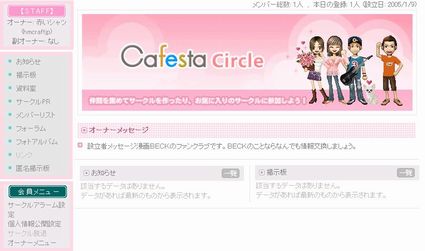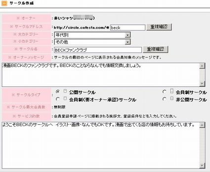 サークルの規約に同意したあと、 各項目に適切な情報を入力してください。 思い通りのサークルを作成できます。 また、サークル作成の際に登録した情報はサークル作成後にも変更が可能です。 つくるサークルのタイプを選ぼう サークルには、 『公開サークル』 カフェスタユーザーであれば誰でもサークルを利用することができます。 『会員制サークル』 カフェスタユーザーであれば簡単な加入申し込みをするだけで サークルを利用することができます。 『会員制サークル(要オーナー承認)』 加入するには、オーナーの承認が必要になります。 『非公開サークル』 URLを知っていなければサークルへ行くことすらできません。 以上の4つのサークルタイプがあります。 サークルタイプはサークルの活動形態によって使い分けることができます。 例えば、インターネット上でサークル活動を盛んに行い メンバーを増やしたい場合は『公開サークル』に設定し、 誰でも参加自由なサークルにすることができますし、 仲間だけで楽しみたい場合には『会員制サークル(要オーナー承認)』に設定し、 新しいユーザーの加入を制限することもできます。 サークルタイプはサークルオーナーによっていつでも変更することができます。 サークルが作成できない まずはサークル約款に同意する項目にチェックが入っているかどうか確認してください。 同意しないとサークルは作成することができません。 また、同意後、サークル作成フォームに入力していない項目がある場合も サークルを作成することはできません。 全ての情報を入力してもサークルが作成できなかった場合は、 カフェスタのサポートデスクまでお問い合わせください |