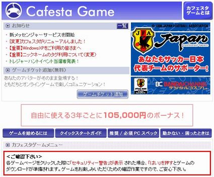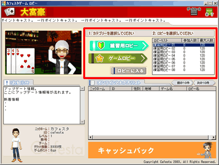 遊びたいゲームを選択し「プレーする」ボタンをクリックしてください ゲームをするために必要な基本データをダウンロード。 ダウンロードが終了して、各々ゲームページが表示されたら、 「ゲームスタート」ボタンをクリック ゲームロビーに入ったら、 「練習用ロビー」もしくは「ゲームロビー」を選択し、 ロビーリストから入室したいロビーをクリック ゲームを始めるには 各々ゲーム専用のデータをダウンロードする必要があります。 ・初めて各ゲームページへ行く際 ・始めて各々ゲームの「ゲームスタート」ボタンをクリックした際 ・ゲームのデータが更新された際 に専用データがダウンロードされます。 ダウンロードを行わないと、ゲームが正常に動きません |