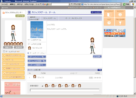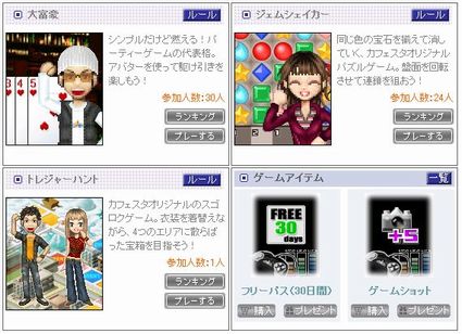 カフェスタゲームとは、みなさまのアバターがゲームの中にそのまま登場して、 楽しく活躍する、新しいタイプのオンライン対戦ゲームです。 |